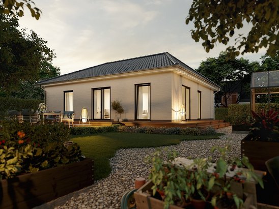Der Bungalow 110 bietet auf einer Ebene viel Platz für die ganze Familie – mit hellem Wohnbereich, 3 Schlafzimmern und direktem Gartenzugang. Das Walmdach verleiht Charakter. Jetzt anfragen und stufenlos wohnen!