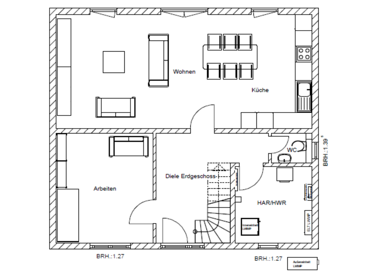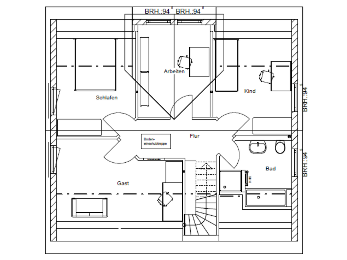 Das fast 135 m² große Flair 134 bietet Freiraum für die ganze Familie. Die offen gestaltete Diele führt direkt ins großzügig angelegte Wohnzimmer, das in dieser Hausvariante den Essbereich und die Küche integriert und damit zum Mittelpunkt für den Familienalltag wird. Aus der ursprünglichen Küche wurde so ein Arbeitszimmer. Darüber hinaus wurde das Gäste-WC in ein Duschbad erweitert.
